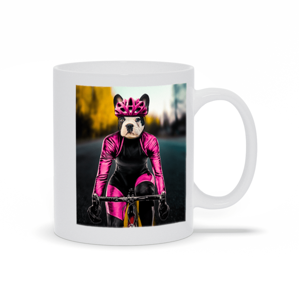 Combine your favorite morning beverage with a personalized mug featuring your dog (or any other pet)! Our Female Cyclist personalized mug is an 11 oz dishwasher safe ceramic mug featuring a personalized version of our design starring your pets adorable face! Our custom mugs make a unique personalized gift for any pet owner.