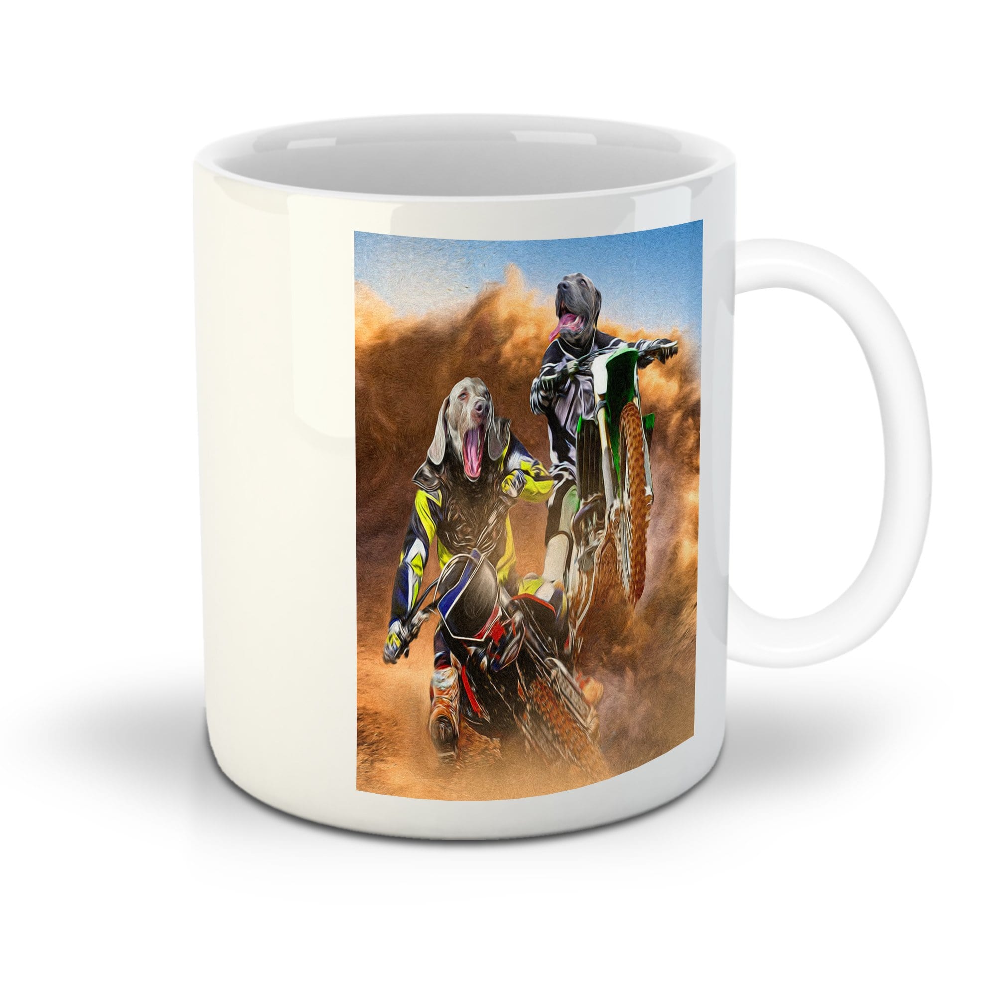 Combine your favorite morning beverage with a personalized mug featuring your dogs (or any other pets)! Our ‘Motocross Rider’ personalized mug is an 11 oz dishwasher safe ceramic mug featuring a personalized version of our design starring your pets’ adorable faces! Our custom mugs make a unique personalized gift for any pet owner.